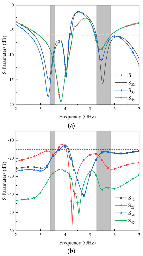 Simulated coefficients of the proposed MIMO antenna: (a) the reflection coefficient of Ant. 1 to Ant. 4; (b) the transmission coefficient of Ant. 1 to Ant. 5.
