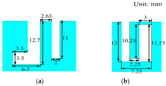 The dimensions of the slot on the top surface of the system board for two different shapes are depicted in Figure 10. Both the L-shaped slot and the rectangular slot are situated between Ant.5 and Ant.6. In Figure 1b, it can be observed that the inverted L-shaped slot and the rectangular slot share the same dimensions as their counterparts, the L-shaped slot and rectangular slot, respectively. These inverted L-shaped and rectangular slots are etched between Ant.1 and Ant.2, Ant.3 and Ant.4, as well as Ant.7 and Ant.8. Additionally, the inverted U-shaped slots mirror the dimensions of the U-shaped slot presented in Figure 10b. Figure 1a illustrates that both the U-shaped slots and the inverted U-shaped slots are etched between Ant.2 and Ant.3, as well as Ant.6 and Ant.7.
