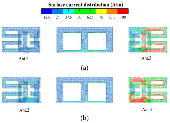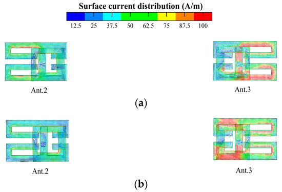 Current distribution with isolation structure (only Ant. 3 is active) at different working frequencies: (a) 3.5 GHz; (b) 5.5 GHz.