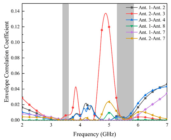 As shown in Figure 13, the envelope correlation coefficient (ECC) is below 0.024 in both frequency bands, which is lower than the threshold of 0.5 for the normal operation of a MIMO antenna. A low ECC value indicates that the antenna has a good MIMO correlation and better diversity performance. The ECC values are calculated by Equation (1).