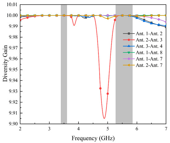 Figure 14 shows the diversity gain (DG) of the proposed antenna, which is higher than 9.99 dB in both operating bands. Therefore, the antenna has good anti-jamming ability and low signal-to-noise ratio fluctuation.