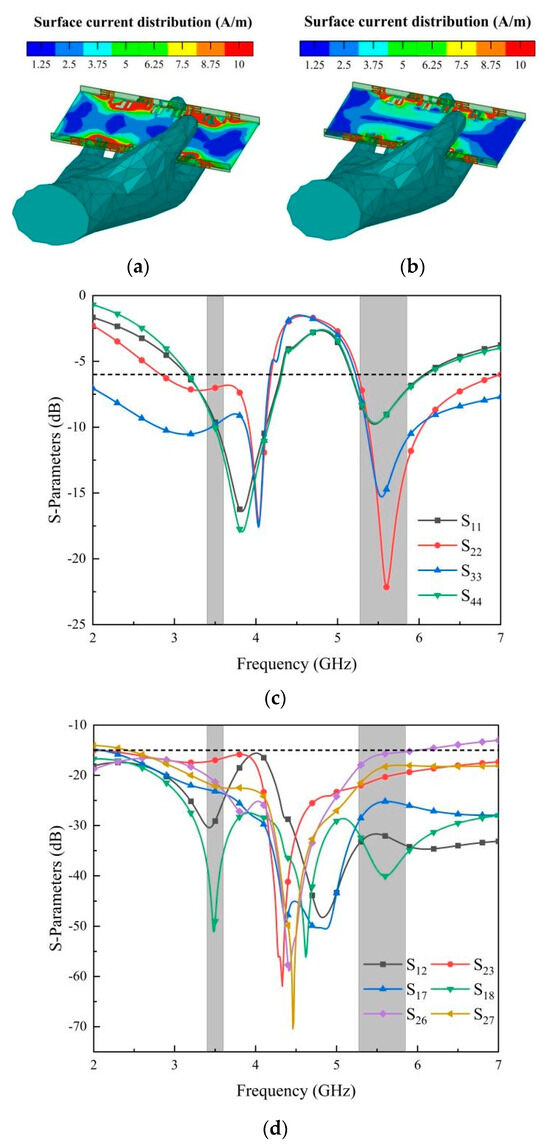 The results in Figure 15 illustrate the performance of the MIMO antenna in a practical application scenario. Figure 15a,b show the influence of the human hand on the antenna current distribution at 3.5 GHz and 5.5 GHz. Figure 15c,d show the influence of the human body on the antenna S-parameters, respectively. In the operating frequency bands, the antenna exhibits a return loss better than −6 dB, and the isolation of the antenna is better than 15 dB. The performance of the antenna meets the design requirements.