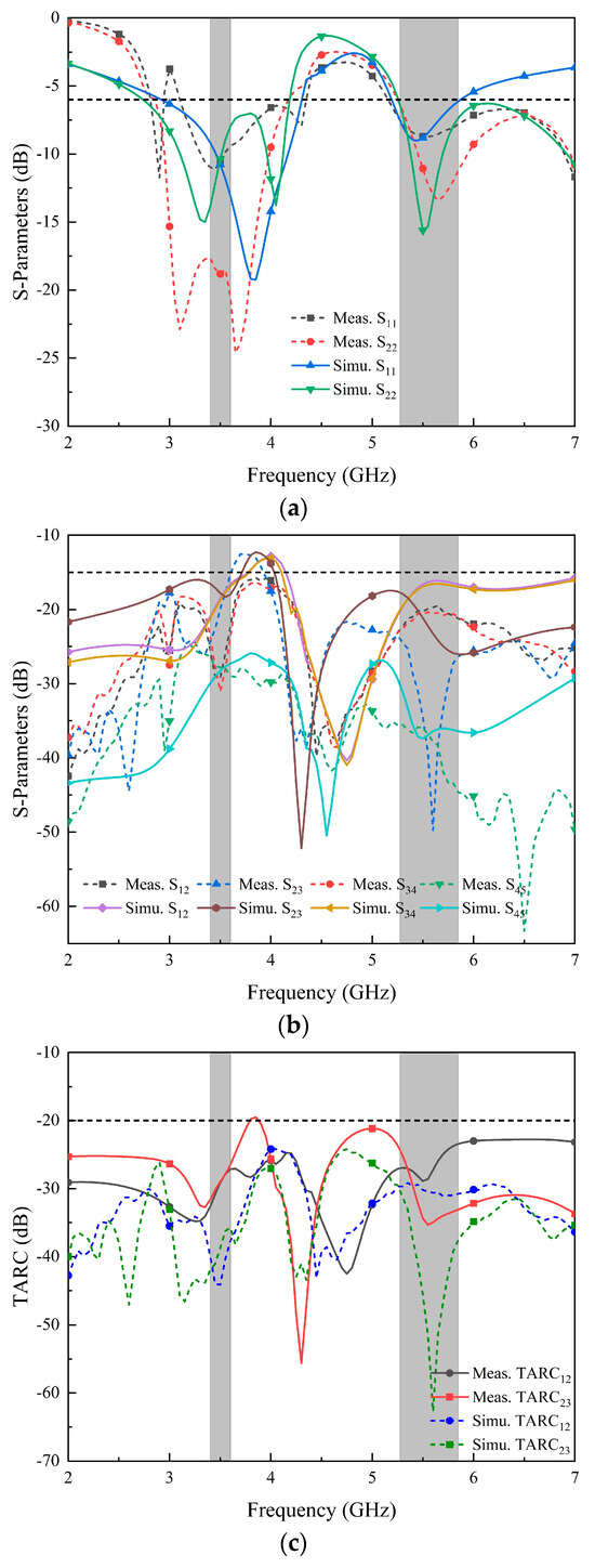 The S-parameters were measured using the vector network analyzer (VNA) instrument. The measured and simulated parameters are shown in Figure 18. The measured results roughly match the simulation results, and small model errors are observed due to manufacturing process issues. It can be seen from the figure that Ant. 1–Ant. 4 show good parameter characteristics in the n78 (3400–3600 MHz) and WLAN band (5275–5850 MHz). It is worth noting that the isolation between Ant. 1 and Ant. 4 in the actual measurement is better than the simulation characteristics, and isolation is better than 15 dB in all frequency bands. Figure 18c shows the parameters of the total active reflection coefficient (TARC) between different ports. The results show that TARC is lower than −20 dB in the working frequency bands.