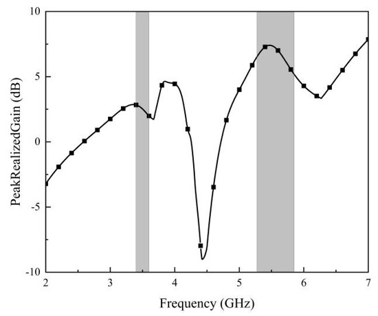 As depicted in Figure 19, the minimum and maximum gain in the 3400–3600 MHz frequency band is 1.99 dB and 2.83 dB, respectively. In the frequency band of 5275–5850 MHz, the lowest gain of the antenna is 5.19 dB, and the highest gain reaches 7.4 dB.