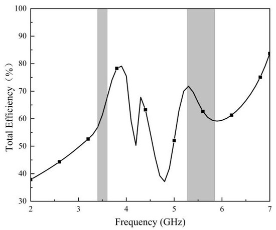 Figure 20 shows the efficiency curve of this MIMO antenna, from which the antenna has a minimum efficiency of 58% and a maximum efficiency of 68% in the frequency band of 3400–3600 MHz. In addition, the antenna has a minimum efficiency of 59% and a maximum efficiency of 72% in the band of 5275–5850 MHz. The MIMO antenna has high-efficiency characteristics in the operating frequency bands.