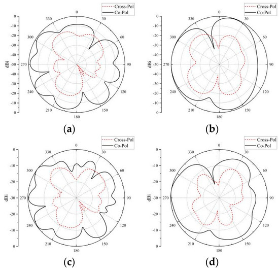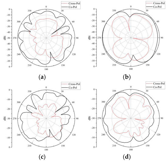 The simulated and measured data of co-pol and cross-pol at different frequency bands are shown in Figure 21 and Figure 22. The co-pol and cross-pol radiation patterns are represented by the dashed and solid lines, respectively. The co-pol radiation of the antenna will dominate the overall radiation effect of the antenna. The cross-pol of the antenna will cause interference with the overall radiation effect of the antenna, which should be minimized as much as possible. From the results, the radiation curve of the co-pol is larger than that of the cross-pol. The actual effect of the antenna is consistent with the simulation results.