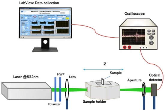 A schematic of the open aperture z-scan system is shown in Figure 1. The laser system comprises a frequency-doubled Nd:YAG laser (Continuum Minilite II) emitting at 532 nm with a pulse width of 3–5 ns and a beam waist of 55 μm. A 20 mm lens is used to focus the laser beam, and the beam intensity is kept constant for all z-scan measurements. The AuNP/5CB liquid crystal cell is mounted on a translation stage (Thorlabs NRT 150) and moved freely along the z-axis, passing through the laser beam’s focal point. The transmittance data are collected using an optical detector (Newport 818-SL), while the translation of the stage and data acquisition are meticulously controlled through a LabView routine. Additionally, the setup consists of a polarizer and a half-wave plate (HWP) to manipulate the polarization orientation of the laser beam. Despite the laser’s initial vertical polarization, a polarizer is introduced for ease of alignment. Notably, the angle between the input and output polarizations of the HWP is twice the angle between the input polarization (i.e., the polarizer) and the fast axis of the HWP. As a result, by setting the angle between the polarizer and the HWP’s fast axis to 45°, the HWP plate achieves a 90° rotation, converting vertically polarized light into horizontal polarization. Thus, to achieve polarization angles of 0°, 45°, and 90°, the angle between the polarizer and the fast axis of the HWP is meticulously adjusted to 0°, 22.5°, and 45°, respectively.