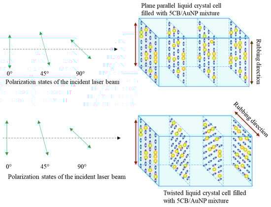Schematic of the “vertical” arrangement of the liquid crystal cell with respect to the polarization of the incident light. Parallel (top) and twisted (bottom) nematic liquid crystal cells with AuNPs dispersed in them.