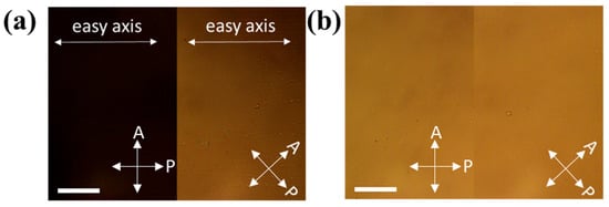 Cross-polarized and optical microscopy images of (a) oriented and (b) twisted cells. Angles of A—analyzer, and P—polarizer shown in lower right corners. (Scale bars are 50 μm).