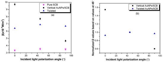 The absolute and relative values of β for all the samples are shown in Figure 4. The β values for the pure 5CB samples are much lower and are independent of the polarization. However, the β values for the AuNP/5CB samples are 2–3 times higher and depend on the polarization of the incident light and the type of liquid crystal cell. For the parallel-oriented AuNP/5CB cell, the β values decrease as the polarization of the incident light is changed from 0° to 90° with respect to the rubbing surface, as shown in Figure 4a. The effect is the same but reversed when the cell is rotated by 90° (see Figure A3 and Figure A4 in Appendix A). In both cases, β is optimum when the polarization of the incident light is parallel to the rubbing direction.