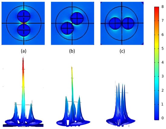 In this simulation, two 10 nm radius gold nanoparticles were suspended in aqueous solution and excited by a 520 nm wavelength plane wave incident along the z-axis and polarized along the x-axis. The amplitude of the electric field was 1 V/m, and instead of rotating the polarization of the light, the relative positions of the nanoparticles were adjusted to allow for easier comparisons. Field enhancement of the localized electric field was observed for a series of different separation distances, but presented here are the results for a separation of 2 nm between the spheres. Figure 5 shows the norm of the electric field in local space across a xy-plane cut for the three relative orientations (0°, 45°, and 90° to the incident light). Since the incident field strength was set to 1 V/m, these values represent the field enhancement. This is also visualized as a height map of electric field intensity. Therefore, from Figure 4 and Figure 5, it can be concluded that when oriented parallel to the incident light, the AuNPs show strong coupling, which lessens at 45° and does not exist at the 90° orientation.