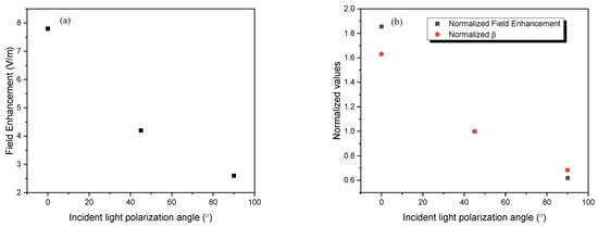 The plot in Figure 6 shows the field enhancements and their normalization against 45°, and then compared against the normalized β values from the experiment. At 0°, the dimer exhibits roughly three times the field enhancement at 90°. With no coupling, while aligned perpendicular to the incident light, the AuNPs act as individual particles, and as such, this change in field enhancement is in line with expected values []. When normalized to 45° to compare against the β values from the experiment, we see that they are almost identical.
