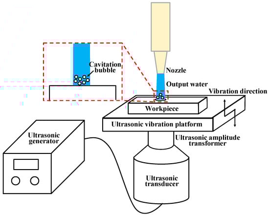 The experiments were performed using the WL1520 waterjet machine produced by Wonlean Tech, Liaoning, China. The machine was equipped with a three-axis CNC cutting head with a positioning accuracy of approximately ±0.05 mm, while its cutting accuracy is approximately ±0.1 mm. The highest pressure produced using the extra-high voltage generator was 410 MPa. The ultrasonic vibration system comprised an ultrasonic generator, an ultrasonic transducer, an ultrasonic amplitude transformer, and an ultrasonic vibration platform. The ultrasonic vibration platform has dimensions of 200 × 200 mm. The output frequency of the ultrasonic generator is stable at about 20 kHz, and the output amplitude can be changed by adjusting the power of the ultrasonic generator. The ultrasonic vibration platform is equipped with an integrated amplitude transformer and an ultrasonic transducer, enabling the ultrasonic vibration platform to oscillate vertically in the Z-direction. Consequently, this allowed the CFRP laminate to undergo induced vibrations along the direction of jet movement with a specific amplitude.