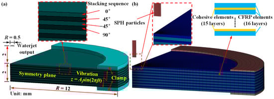 The WJ drilling process was modeled to study the hydrodynamic characteristics of a WJ under the effect of ultrasonic vibration. This study utilizes the commercial explicit dynamic solver LS-DYNA (LSTC, Livermore, CA, USA) to establish a three-dimensional (3D) coupled SPH-FEM model to model the process of an ultrahigh-velocity WJ impacting the target CFRP laminate under ultrasonic vibration. This was carried out to investigate the effects of ultrasonic parameters on hole quality and damages such as the delamination and cracking of CFRP laminates. Figure 2 shows geometric and finite element models of the numerical simulation.