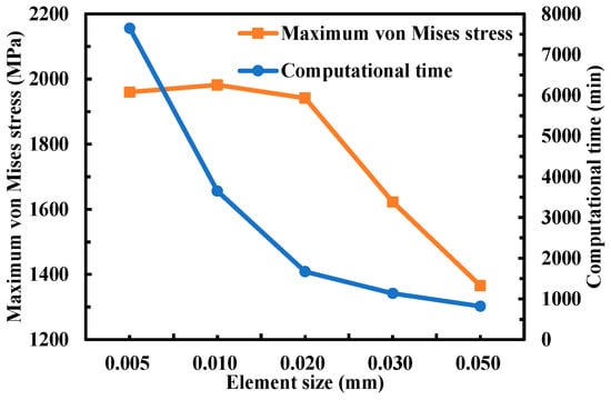 The element mesh sizes of 0.02 and 0.03 mm exhibit a discrepancy of 19.7% in predicting the von Mises stress; thus, the solution is dependent on the mesh size. Comparing the results of the mesh sizes of 0.01 and 0.02 mm, the maximum von Mises stress prediction differences are within 3%, demonstrating minimal solution dependency on the mesh. However, the computation time of the 0.01 and 0.02 mm meshes significantly differed such that the total computational times of the mesh sizes of 0.01 and 0.02 mm were 3652 and 1672 min, respectively. Thus, a mesh size of 0.02 mm was adopted.