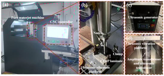 Ultrasonic-vibration-assisted waterjet system. (a) Pure waterjet machining center. (b) Cutting head and processing platform. (c) Ultrasonic generator. (d) Ultrasonic-vibration-integrated platform.