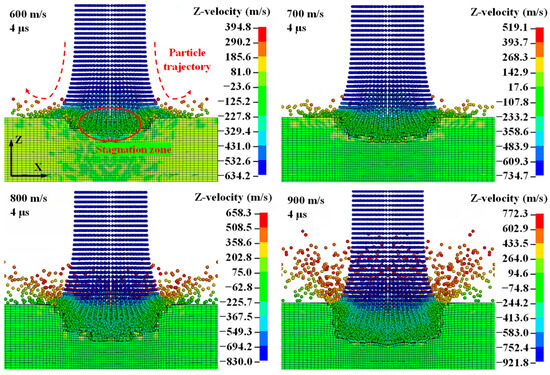 Figure 5 shows the dynamic characteristics of the high-velocity pure WJ impacting the flat surface of the CFRP laminate. A relatively low WJ velocity in the Z-direction can be observed in the stagnation zone. This phenomenon can be attributed to the fact that when the WJ particles impinge on the flat surface of the material, it rebounds, and the back flow plays an important role in damping the velocity of the subsequent WJ. Thus, a stagnation zone is formed with a relatively low WJ velocity []. The contour of the velocity and particle trajectory demonstrate the aforementioned conclusion. As shown in Figure 3, the velocity of the material was set to 0, whereas the velocity of the incoming WJ was greater than the initial velocity (ignoring the effect of gravity). This is due to the high-frequency vibration with an amplitude of 10 μm on the CFRP laminate material. Thus, the WJ exhibited a higher incoming velocity, and the actual kinetic energy of the WJ increased.