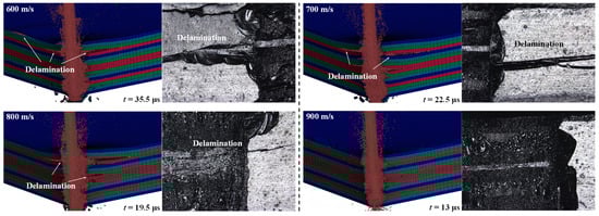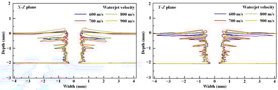 Figure 7 compares the cross-sectional profiles of the holes drilled at various WJ velocities. The cross-sectional profile of the drilled hole can be approximated as a trapezoid. As the depth of the drilled holes increases, the hole width decreases. This phenomenon, known as the “kerf angle”, has been obtained in the experimental results of other studies []. It is characteristic of the WJ drilling process and demonstrates the accuracy of the simulation method. Delamination occurs in the longitudinal and transverse directions, as determined from the comparison of the X-Z and Y-Z planes, and the damage is asymmetrical owing to the anisotropic nature of CFRP laminates. When the WJ impinges on the CFRP laminate, the surface erodes, and the material is removed. The cohesive elements are also removed during this process, thereby inducing the initiation and expansion of the delamination area. The WJ wedges into the interlaminate interface and contributes to the warping of the CFRP laminate, particularly under the impingement of the WJ at velocities of 700 and 800 m/s. The delamination area decreases and the quality of the cross-sectional profile improves with an increase in the WJ velocity.