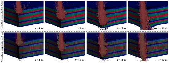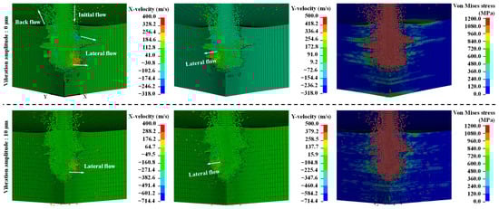 Figure 8 shows the effects of ultrasonic vibration on the velocity of the WJ flow at an initial WJ velocity of 900 m/s. When the high-velocity WJ impinged on the CFRP laminate, not all the WJ energy contributed to the removal of the material. When the WJ penetrated the CFRP laminate material, part of the WJ flow rebounded off of the target, and the divergent flow may have contributed to the back flow and lateral flow []. Once delamination had been initiated on the side wall, the lateral flow may have wedged into the crack and enlarged the delamination (Figure 8). The velocity components of the WJ in the X- and Y-directions without ultrasonic vibration are near 500 m/s, inducing a larger lateral flow and an enlarged delamination area. Furthermore, as shown in the von Mises stress distribution, the stress of elements near the lateral flow exceeded that of other elements. Contrarily, the velocity components of the WJ in the X- and Y-directions with ultrasonic vibration were considerably lower, and the delamination area was reduced. Thus, high-frequency ultrasonic vibration plays a role in decreasing lateral flow, reducing the delamination area.