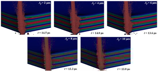 Figure 6 shows that the numerical and experimental results of the distribution of delamination zones extended along the interlaminate interface of the CFRP laminate via the WJ impact at different initial velocities (f = 20 kHz and Af = 10 μm). It can be seen that with an increase in the WJ velocity, the machining time of the drilling process decreases from 35.5 to 13 μs. With an increase in the WJ velocity, the kinetic energy of the jet particle increases, resulting in a reduction in drilling time. Regarding the delamination area of the CFRP laminate drilled at varying WJ velocities, an increase in the WJ velocity causes a decrease in the delamination area of the CFRP laminate. The topography of the drilled hole sidewall observed using a 3D laser confocal scanning microscope shows the same tendency as that exhibited by the numerical results, and when the WJ velocity reached 900 m/s, the sidewall of the drilled hole barely exhibited a delamination area. The increase in the WJ velocity causes an increase in the kinetic energy of the WJ. When the WJ approaches the second or third layer, the high-speed WJ has surplus kinetic energy, and it is more likely that the elements of the second or third layer will be removed. Thus, the lateral flow is unlikely to induce the removal of the interlayer elements and the extension of delamination. Therefore, during ultrasonic-vibration-assisted hole drilling, a larger initial WJ velocity is beneficial for achieving high-quality holes.