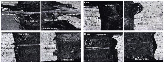 Figure 11 shows the surface morphologies of the drilled-hole sidewalls observed using a confocal scanning microscope. Without ultrasonic vibration, a severe delamination area appeared, and the quality of the drilled hole sidewalls became poor, especially at the bottom orifice. With the increase in the vibration amplitude, the delamination area decreases, which is consistent with the phenomenon presented in the numerical results. It can also be seen in Figure 11 that the sidewalls of the drilled hole may be subjected to excessive material removal, leading to the poor quality of the sidewall. This can be attributed to the lateral flow (as shown in Figure 8). Some other micro-defects, such as fiber pull-out, fiber fragment, and bending failure, can also be observed in Figure 11.