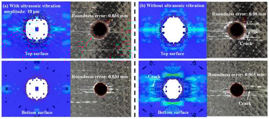 Figure 12 shows a morphological comparison of the erosion surface with and without ultrasonic assisted drilling. The roundness error of the top orifice drilled with ultrasonic vibration assistance is a mere 0.036 mm, whereas without vibration assistance, the roundness error increases to 0.08 mm. Similarly, the roundness of the bottom orifice drilled with ultrasonic assistance exhibits superior results. Additionally, the distribution of cracks on the erosion surface corresponding to ultrasonic-assisted hole drilling is noticeably reduced. The cracks on the erosion surface display greater length and higher density in the absence of ultrasonic assistance. This phenomenon can be attributed to the lower stress distribution on both the top and bottom surfaces of the CFRP laminate. The application of ultrasonic vibrations can significantly enhance erosion surface quality.