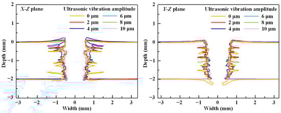 Figure 13 shows the cross-sectional profiles of holes drilled at various ultrasonic vibration amplitudes at a machining time of t = 16.0 μs. The cross-sectional profile along the X–Z plane significantly differs from the profile along the Y–Z plane. The cross-sectional profile along the Y–Z plane can be approximated as a trapezoid, particularly the cross-sectional profile of the drilled hole associated with ultrasonic vibration at an amplitude of 4 μm along the X–Z plane. The back flow and lateral flow of the WJ contributed to the removal of the inner-layer elements outside the impact zone, resulting in poor-quality drilled holes. For the six profiles of holes drilled at varying amplitudes, the delamination area decreases with an increase in the amplitude. At an ultrasonic vibration amplitude of 10 μm, the profile of the WJ-drilled CFRP laminate hardly exhibits a delamination zone. Thus, ultrasonic vibration can significantly improve hole quality, and optimal hole quality can be obtained at an ultrasonic vibration amplitude of 10 μm.