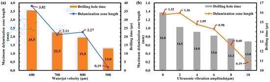 Changes in delamination length and machining time with the WJ velocity and ultrasonic vibration amplitude (a) with ultrasonic vibration at a constant frequency of 20 kHz and an amplitude of 10 μm and (b) a drilling WJ velocity of 900 m/s and ultrasonic vibration at a constant frequency of 20 kHz.