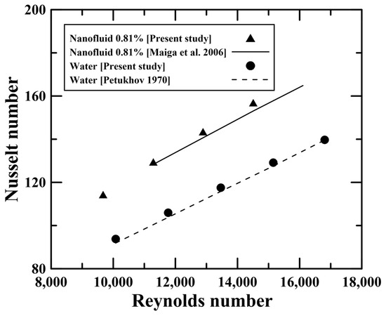 Figure 3 compares previously suggested correlations with the predicted Nusselt numbers from the present simulation. In the case of water, it was found that the two-phase Eulerian model had a small difference (i.e., 2.12%) from the Petukhov correlation. The Nusselt number of the 0.81 vol.% Al2O3 nanofluid also showed a small difference (i.e., 2.51%) from the Maiga correlation. Based on these findings, the two-phase Eulerian model could be expected to accurately predict the heat transfer characteristics of nanofluids.