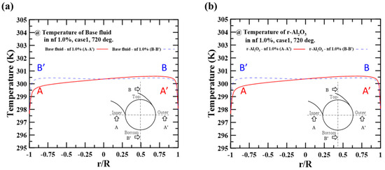 Figure 6a,b show the temperature profiles of the base fluid and the particle at the hot side. As shown in Figure 6a, the temperature distribution was also biased toward the outer region (i.e., r/R~1 at A-A’ crossline). This finding can be explained through reference to the velocity distribution. At the fixed flow rate condition on the cold side, the low velocity near the hot side’s inner region (i.e., r/R~−1 at A-A’ crossline) caused significant heat dissipation to the cold side, lowering the temperature. Figure 6b also shows that the particle temperatures had similar values to the fluid temperatures; the base fluid showed an average temperature of 300.8 K while the Al2O3 particle showed a temperature of 300.5 K. This result means that the particle interface in the nanofluid was unaffected by the heat transfer. Accordingly, the results predicted at the present numerical condition (i.e., flow rate and nanofluid concentration) did not have to account for the interface’s shear force and heat transfer.