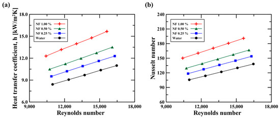 Figure 7a,b show the heat transfer coefficient and the Nusselt number at the hot side (i.e., center tube), where the nanofluid passes. The x-axis represents the Reynolds number. The Reynolds number () was calculated as follows:
