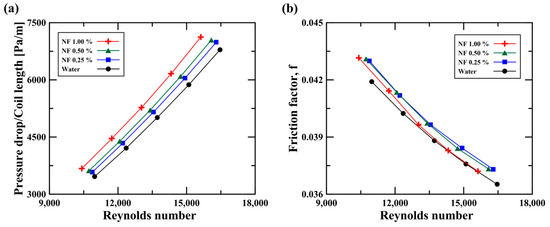 As shown in Figure 8b, it was found that the friction factor at the 1.0 vol.% nanofluid was lower than that for the 0.25 vol.% nanofluid. Although there was a low friction factor at the high concentration, the pressure drop increased due to the high fluid density and viscosity. Therefore, an increased concentration of nanofluids would contribute to the rise in pressure drop due to the enhanced flow resistance owing to the increased fluid density and viscosity (i.e., .