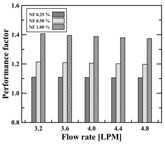 Performance factor of the nanofluids at different concentrations and under various flow rate conditions.