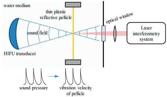 The schematic diagram of the HIFU sound pressure measurement based on laser interferometry is shown in Figure 1. The HIFU transducer and thin plastic reflective pellicle are placed in the water tank. The sound axis direction is perpendicular to the pellicle, and the sound focal point is located on the pellicle. In order to ensure that the vibration of the pellicle follows the sound wave, the thickness of the pellicle needs to be much less than the wavelength of the sound wave. The thickness of the pellicle used in the experiment is 15 μm. The wavelengths of the acoustic waves corresponding to the frequencies of 1 MHz and 3 MHz are 1.5 mm and 0.5 mm, respectively, which are far greater than the thickness of the pellicle.