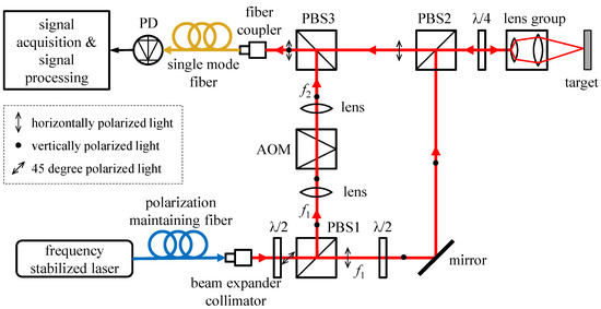 To realize the above-mentioned purpose, this article uses an AOM to obtain a high-frequency optical carrier, and the optical path of the designed high-bandwidth laser heterodyne interference system is shown in Figure 2. The laser with frequency f1 emitted by the frequency-stabilized laser is emitted after passing through the polarization-maintaining fiber and the beam-expanding collimator. After passing through the λ/2 wave plate, the laser is divided into two by PBS1 (polarized beam splitter). The transmitted light, as a measuring beam, passes through the λ/2 wave plate, reflector, PBS2, λ/4 wave plate, and lens group and is incident on the surface of the measured object. The measuring beam reflected by the target passes through the λ/4 wave plate again, is transmitted at PBS2, and is incident on the optical fiber coupler after passing through PBS3. The reflected beam of PBS1 passes through the lens and AOM, and its frequency changes from f1 to f2. This beam is used as a reference beam and is incident on the optical fiber coupler after being reflected by PBS3. The reference beam and the measuring beam interfere at the fiber coupler and are coupled with the single-mode fiber. Through the interference signal formed by the photodetector (PD), the measured vibration information is obtained through signal processing.