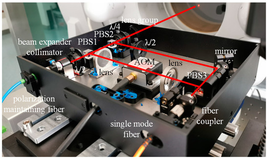 The AOM is produced by AA Sa Opto-Electronic, and its model ID is MT350-A0.12. Its frequency shift size is about 358 MHz. Since the effective optical aperture of the AOM is only 0.12 mm, in order to improve the light energy utilization ratio, two convergent lenses are used before and after the AOM, and the focus of the two lenses is at the center of the effective working area of the AOM. To improve the spatial resolution of the sound pressure measurement, a variable focal length lens group was designed at the output end of the measuring light. By adjusting the focal length, the optical focus coincides with the position of the thin film. To improve the stability and convenience of the interference system, the light source and photodetector are connected to the optical path by an optical fiber. The interference system is integrated, as shown in Figure 3.
