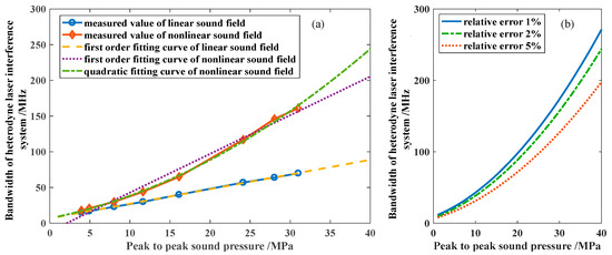 Electrical bandwidth of the heterodyne interference system versus the peak value of the measured sound pressure. (a) When the relative error of the sound pressure is less than 2%; (b) quadratic fitting curves with different relative error requirements under nonlinear sound field.