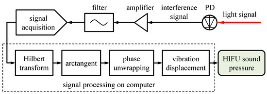 The interference signal output by the PD is amplified and filtered and then collected into the signal processing software on a computer through the signal acquisition unit. In the upper computer, the interference signal undergoes a Hilbert transformation, arctangent processing, and phase unwrapping to obtain vibration displacement information, and finally, the HIFU sound pressure is calculated. The selected PD is the FPD310-FC-VIS high-sensitivity fast PIN photodetector from Menlo Systems, with a bandwidth of 1.5 GHz. The signal acquisition device uses Teledyne LeCroy’s WAVERUNNER 9404 M digital oscilloscope, with a bandwidth of 4 GHz. The bandwidth of the devices used in the electrical signal-processing process can meet the aforementioned requirements.