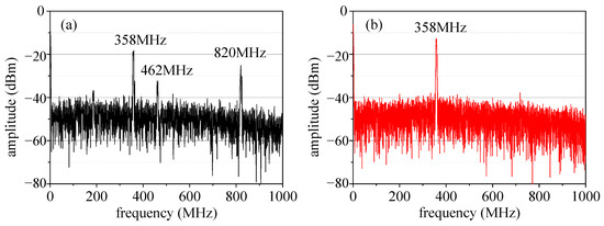 When the target is stationary, by testing the spectrum of the interference signal output using the photodetector, it is found that an unexpected frequency component appears in the interference signal, as shown in Figure 6a. The frequency components contained in the interference signal include 358 MHz, 462 MHz, and 820 MHz, of which 358 MHz is the AOM frequency shift and 820 MHz is the mode spacing of the He-Ne laser. The frequency component of 820 MHz appears in the interference signal because the output light of the He-Ne laser is mixed with other light with a frequency difference of 820 MHz, which is determined by the working principle and internal structure of the light source. After the splitting of the PBS and the frequency shift of AOM, the beams of multiple frequencies interfere with each other to form multiple frequency components in the Interference signal. The frequency component of 462 MHz in the interference signal is formed by the interference of light beams with frequencies of f1 + 358 MHz and f1 + 820 MHz.