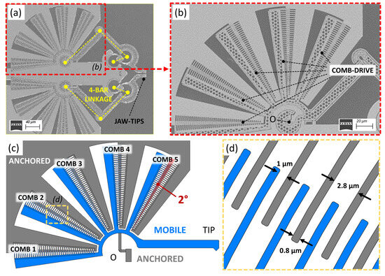 The device under development (Figure 1a) is a nano-gripping system consisting of a double four-bar linkage in a mirrored configuration. Two jaw tips are designed to open and close following a linear trajectory when actuated through two electrostatic rotary actuators. The overall footprint of the device is about (500 × 500) µm2. Such complex motion at this scale can be obtained only by means of a fine adjustment of the geometries of the eight hinges. More specifically, by securing the actuators’ motion as close as possible to an ideal rotation, electrostatic failures, ruptures, and malfunctions can be avoided.