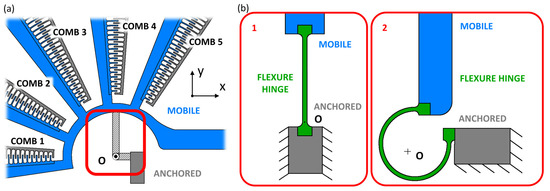 Figure 2 shows a standard revolute joint (red inset in Figure 2a) connecting the fixed part (“ANCHORED” in the figure) to the suspended part (“MOBILE” in the figure) of a rotary comb-drive; here, the joint is replaced by a linear (Figure 2b-1) and curved (Figure 2b-2) flexure hinge. Both flexure hinges consist of 25 μm long, 10 μm thick, and 0.6 μm wide beams; their deflections are originally meant to induce a rotation of the mobile part around the rotation center “O”. When a linear beam replaces the revolute joint, point O is positioned in correspondence with the anchored section [38], while, in cases where the curved beam is used for the joint replacement, point O will be placed in correspondence with the center of the elastic weights [52,63,64] of a beam, whose axis extends around rad (see Figure 2b-2).