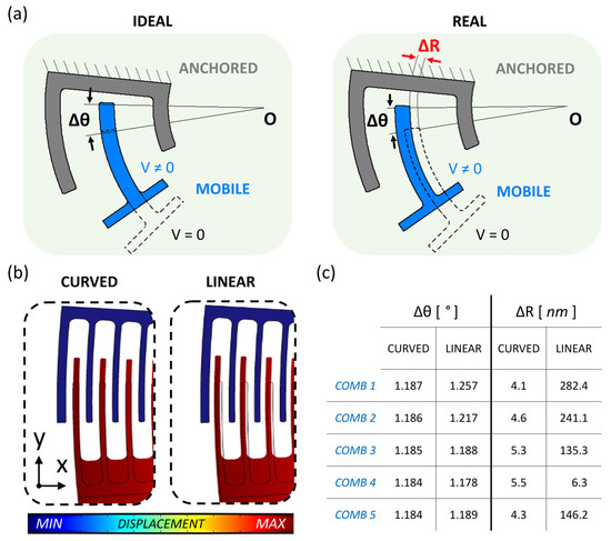 Graphic representation of rotation (Δθ) and radial displacement (ΔR) of the movable comb (mobile) with respect to the fixed comb (anchored) in a rotary comb-drive: (a) ideal rotary joint (left) compared with flexible joint (right) and (b) comparison of simulated comb-drive displacement with curved and linear beam as flexure hinge. (c) Rotation and radial displacement values of the most external mobile finger of each comb-drive for curved and linear flexure hinges.