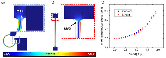 Comparison of simulated Maximum Principal Stress (MPS) for actuation via (a) curved beam and (b) linear beam and (c) trend of MPS values with respect to the applied voltage.