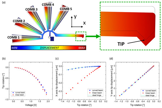 Graphical representation of the displacement made by the device: (a) maximum displacement obtained at 1.9 V when the curved beam is implemented as flexure hinge, with an enlargement on the tip, (b) tip rotation as a function of the applied voltage and tip displacement along (c) x-axis and (d) y-axis vs. tip rotation compared to an ideal rotatory joint.