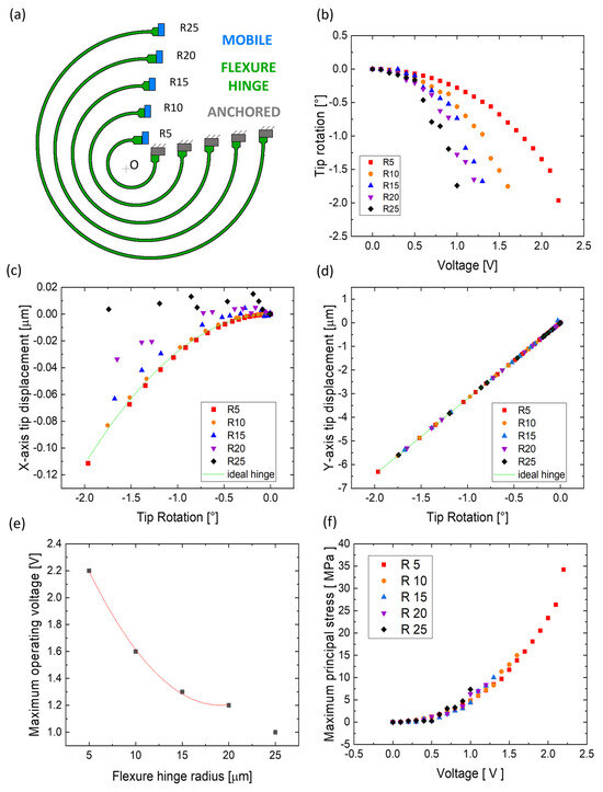 Comparison of the five curved beams with different lengths: (a) schematical comparison considering all hinges shaped as three-quarters of a circle’s arc with radii equal to 5, 10, 15, 20, and 25 μm, corresponding to beam lengths of 25, 48.5, 72, 96, and 119 μm, respectively; (b) tip rotation as a function of the applied voltage and tip displacement along (c) x-axis and (d) y-axis vs. tip rotation compared to an ideal rotatory joint; (e) maximum operating voltage of the actuator before reaching the pull-in state with respect to the flexure hinge’s radius; (f) MPS as a function of the applied voltage.