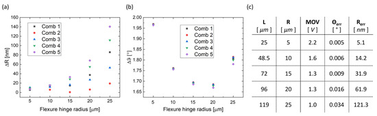Graphical representation of the results obtained for different lengths of the curved beam: (a) angular displacement Δθ of each comb-drive for the five different designs with a radius of 5 μm, 10 μm, 15 μm, 20 μm, and 25 μm and (b) radial displacement ΔR of each comb-drive for the five different designs. (c) Values of θerr and Rerr produced by each design at their MOV.