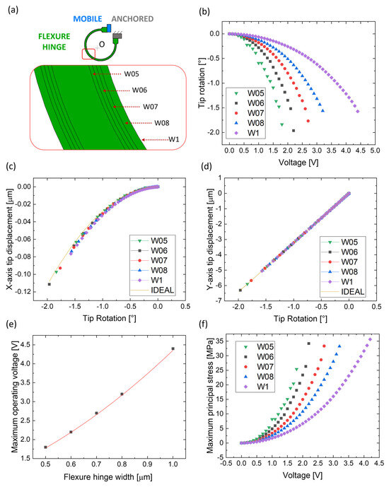 Comparison of the five curved beams with different widths: (a) schematical comparison considering all hinges shaped as three-quarters of a circle’s arc with a width of 0.5 μm (“W05”), 0.6 μm (“W06”), 0.7 μm (“W07”), 0.8 μm (“W08”), and 1 μm (“W1”) and a fixed length of 25 μm; (b) tip rotation as a function of the applied voltage and tip displacement along (c) x-axis and (d) y-axis vs. tip rotation compared to an ideal rotatory joint; (e) maximum operating voltage of the actuator before reaching the pull-in state with respect to the flexure hinge’s radius; (f) MPS as a function of the applied voltage.