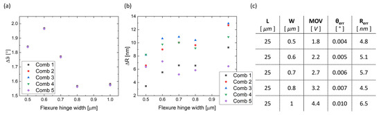 Graphical representation of the results obtained for different widths of the curved beam: (a) angular displacement Δθ of each comb-drive for the five different designs with a width of 0.5 μm, 0.6 μm, 0.7 μm, 0.8 μm, and 1 μm and (b) radial displacement ΔR of each comb-drive for the five different designs. (c) Values of θerr and Rerr produced by each design at their MOV.