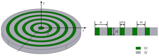As shown in Figure 1, we constructed a three-dimensional schematic diagram of a one-dimensional radial phononic crystal composed of two alternating materials (green represents W, gray represents Si). In Figure 1, the radial phononic crystal cylindrical shell is a one-dimensional cylindrical semi-infinite periodic structure formed by two kinds of solid dielectric materials, W and Si, with different elastic constants and densities in the r direction. The width a1 of the W layer is 6 μm, the width a2 of the Si layer is 10 μm, and the height of the W layer and the Si layer is H = 10 μm. A radial periodic unit is alternately formed by W and Si, and its length is a = 16 μm. Silicon is an anisotropic material, and its crystal orientation and elastic coefficient influence the simulation results. In this paper, the parameters of Si are the crystal orientation, and the elastic coefficients are shown in Table 1.