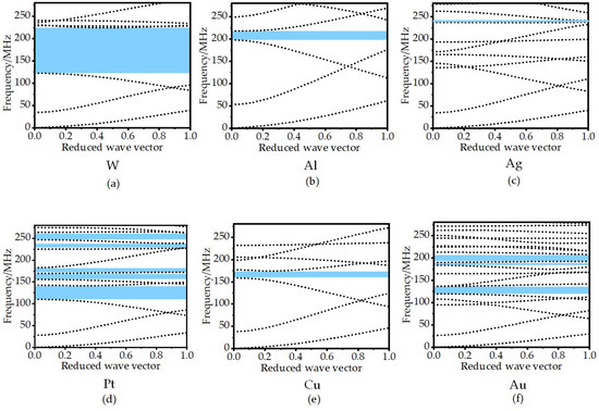 Different materials affect the band gap of the structure. Mass density and Young’s modulus are two main factors in adjusting the band gap for solid–solid phononic crystals. The damping materials can include the following six common metals: W, Al, Ag, Pt, Cu, and Au. Detailed material parameters are shown in Table 2. By comparing the acoustic parameters in the table, we found that the acoustic impedance of metal W is the largest. Furthermore, we simulated the dispersion curves of different materials in the frequency range of 0–280 MHz. Figure 2a shows the wide band gap of 122–225 MHz. Figure 2b is Al metal, and its band gap range is 198–218 MHz. Figure 2c represents the Ag metal, and its band gap ranges are 165–171 MHz, 231–237 MHz, and 238–242 MHz. Figure 2d represents the Pt metal, and its band gap ranges are 110–141.5 MHz, 156–170 MHz, 172–183 MHz, 228.5–238.5 MHz, and 247–263 MHz. Figure 2e represents the Cu metal with a band gap range of 158–177 MHz. Figure 2f represents the Au metal, and its band gap range is 120–136.5 MHz, 168–175 MHz, 192–208 MHz, 227–234 MHz, 250–255 MHz, 262–272 MHz, 273.5–277.5 MHz. By comparing the band gap range generated by the combination of the above six metals and Si, the combination of W and Si was shown to produce the best effect, with a wider band gap width and, thus, an excellent acoustic isolation effect.